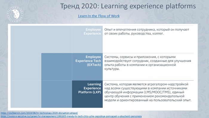 Оказывается, что LXP успешно работает внутри корпораций: хорошо встраивается в рабочее место и агрегирует учебный опыт, являясь своеобразной надстройкой для Employee Experience и Talent Experience Platforms. Известный эксперт в области управления персоналом Джош Берсин считает, что такие платформы вытеснят классические платформы по управлению талантами в компаниях.