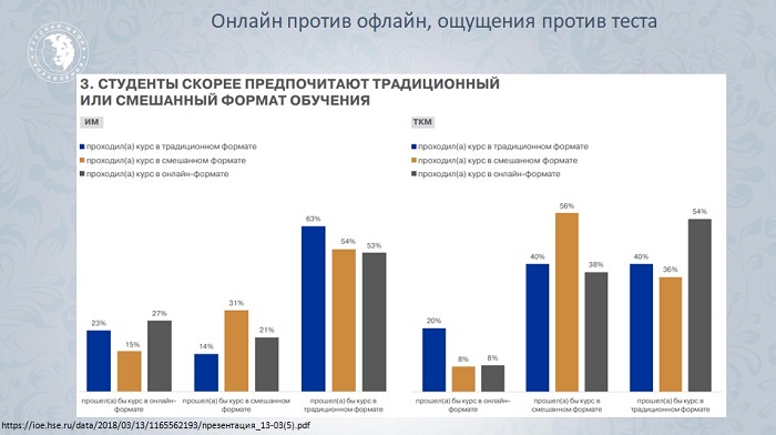 Формат обучения не влияет на результаты студентов. К такому выводу пришли эксперты Высшей школы экономики. Отношение к разным форматам у участников обучения неодинаковое: в онлайне ниже удовлетворенность, а смешанный и офлайн-формат у опрошенных пользуется большей популярностью.